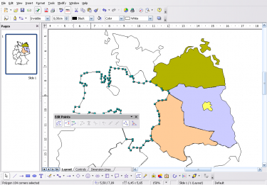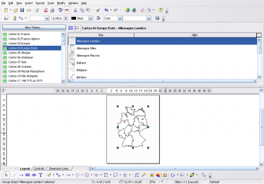 Now it’s time to design a map, and for this article we design a map of Germany. In the Themes pane, select the Cartes 04 Europe Etats, and from the gallery pane select the Allemagne Landers map (to quickly locate the appropriate map, you might want to switch to list view). Drag and drop the map onto a blank drawing. As you may know from your geography classes, Germany consists of several federal states (or just states), and you can see their borders on the map. As it is, the map is pretty bare-bones, and you can spice it up a bit by applying different colors to the states. But before you do that, it is important to understand how OOoHG’s vector-based maps are made. Each element on the map is drawn using Bézier curves, and once all the elements are done, the map is “assembled” using the Group tool, so it acts as a single vector drawing.