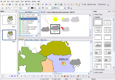 Start with creating a blank Impression presentation. Since you already have the map of Germany with Berlin on it, you can just as well insert it from Draw into the presentation. Simply copy it in Draw and paste it into the currently selected slide in the presentation. Add a header to the slide, for example, Weather Today, and add the appropriate weather symbol from OOoHG Carto 2 Outils ponctuels expressifs theme to the map. Next, left-click on the slide in the Slides pane to the left and select Copy. Left-click anywhere in the Slides pane and select Paste. This creates a new slide identical to the original one. Replace the header with, for example, Weather Tomorrow, and replace the weather symbol with another one (assuming the weather is going to be different the next day, of course). To make the map a bit more snazzy, you can add transition effects to the slides.