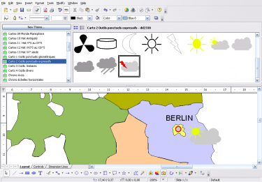 To see why this is important, let’s put some colors on the Berlin and Brandenburg states. To modify the individual elements of the map, select the entire map by clicking on it, then choose Tools > Enter Group (or press F3). Now select the Berlin state, left-click on it and select Edit Points. Alternatively, you can either choose Edit → Points or press F8. In the Edit Points toolbar, press the Close Bézier button, then select the color you want from the Area Style/Filling drop-down list in the Line and Filling toolbar. Repeat these steps for each element (state) on the map. Once you’ve colored the map, leave the Edit Points mode by pressing F8. Now you have a professionally-looking map, but the fun doesn’t have to stop here. OOoHG includes an impressive collection of design elements that you can use to add virtually any type of information to the map. For example, let’s add Berlin to the map. Select the Carto 1 Outils ponctuels géométriques theme, and drag the dd2269 element onto the map. Place it where Berlin is supposed to be, and adjust the circle’s size (to keep the circle’s proportions, press and hold the Shift key while resizing the circle with the mouse). Select the colors you like for the circle’s border and filling. Next, use the Text tool to add a city’s name so you identify it on the map. Want to turn your creation into a weather map? OOoHG has what you need. Select the Carto 2 Outils ponctuels expressifs theme and use the weather symbols (elements from dd2333 to dd2338) that represent different weather conditions.